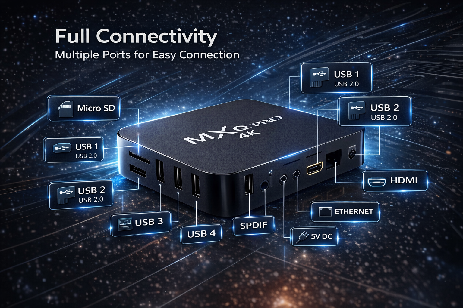Завантажуйте додатки з Play Market, дивіться відео без обмежень та підключайте флешки або геймпади. MXQ PRO 4K — універсальне рішення для сучасного телевізора та активного відпочинку.